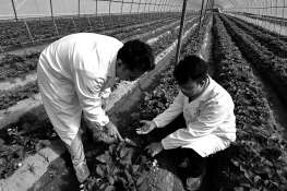 曹利鋒與譚沖博士后觀察改良后鹽堿地的表層土壤質(zhì)量。