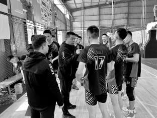樊董偉在場(chǎng)邊指導(dǎo)排球隊(duì)員比賽。
