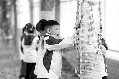 12月23日,江西省上饒市余干縣實驗幼兒園的小朋友們用毛衣與零散毛線,認真地為大樹“穿衣”。韓海建 攝