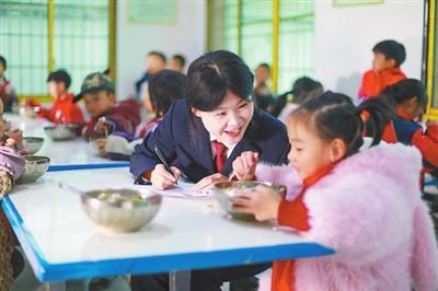 12月24日,檢察干警在貴州省黔西市綠化白族彝族鄉培育小學向學生了解吃營養餐的情況。 周訓超 攝