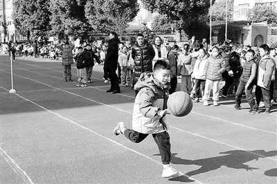 近日,江蘇省無錫市揚名中心小學(xué)冬季趣味運動會上,學(xué)生在參加運球比賽。湯毅 攝