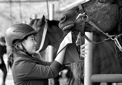 訓(xùn)練后,高三學(xué)生王燕琪給“黑豹”(馬名)洗澡。