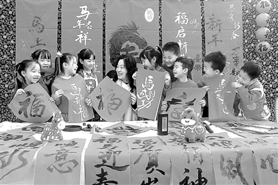 近日,在山東省高密市金蘋果幼兒園,老師與孩子們一起曬福字、互致問候。李海濤 攝