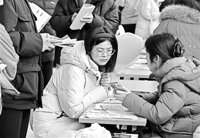 1月30日,求職者在青島西海岸新區(qū)人力資源大市場參加“青雁歸巢”招聘會。