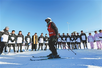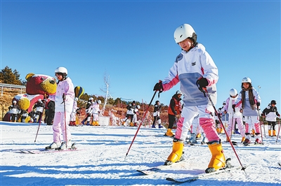 內蒙古自治區鄂爾多斯市,九城宮國際滑雪場,冬日的陽光斜照雪道,泛著細碎的銀光?!皽p速時,雪板呈‘內八’,腳尖向內,膝蓋下壓……”學生們低聲重復動作要領,試探挪動腳下的雪板,在教練的引導下開始緩緩向前滑行。