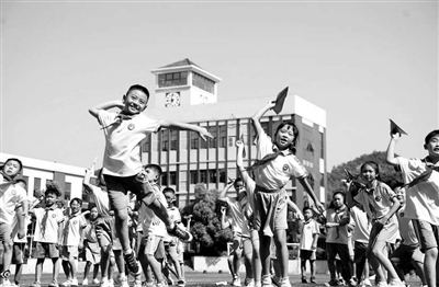 在秋季開學第一課,博才云時代小學學生放飛自己精心書寫的彩色紙飛機。 王媛 攝