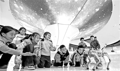 近日,在甘肅省張掖科技館現(xiàn)代科技展示區(qū),小朋友在同機器狗互動。王將 鄧亞萍 攝