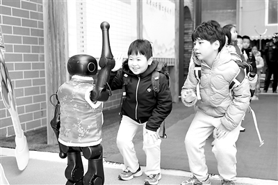 北京市東城區府學胡同小學學生與機器人打招呼。學校供圖