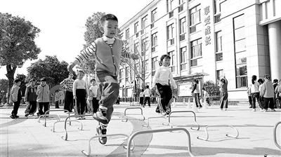 武義縣壺山小學學生體育大課間跳越小跨欄架進行體能素質訓練。傅洪尉 攝