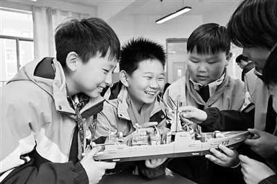 三月十七日,在河南省商丘市夏邑縣育才學校,學生在“國際航海日”主題班會上觀看手工制作的艦船模型。苗育才 攝