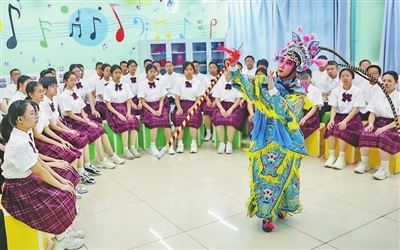 3月26日,河北省秦皇島市第十六中學學生表演京劇《扈家莊》。當日,該校開展“戲劇文化進校園”活動,通過引導學生學習戲劇知識等方式,讓學生感受傳統文化的魅力,迎接世界戲劇日(3月27日)的到來。 曹建雄 攝