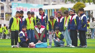 近日,專業應急救援人員給四川省眉山市彭山區鵬利小學學生講解應急救護知識。翁光建 攝