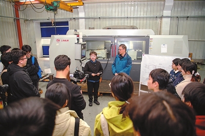 “這臺設備的床身導軌采用了我們自主研發的靜壓技術……”上海機床廠技術中心副主任宋治中率先開講,他帶領學生深入了解現代化磨床的生產流程。
