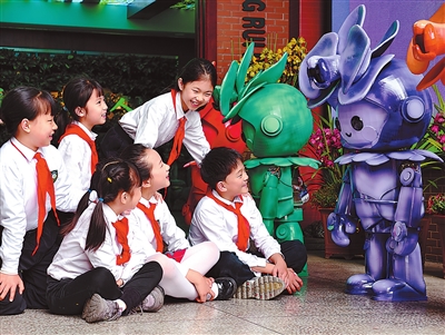 重慶樹(shù)人景瑞小學(xué)校學(xué)生課間與智能機(jī)器人就校園生活對(duì)話。
