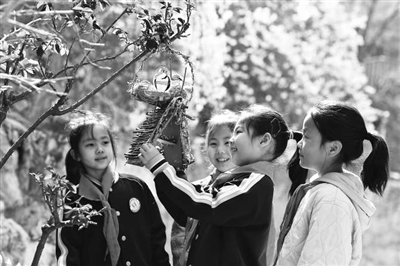 在山東省青島市市北區宜陽路小學開展的愛鳥護鳥主題活動中,學生在為小鳥懸掛“新家”。 通訊員 王海濱 攝