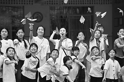 4月16日,在梧州市長(zhǎng)洲區(qū)倒水鎮(zhèn)大橋小學(xué),送教老師和學(xué)生一起放紙飛機(jī)。