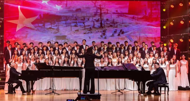 由何應聰老師執棒、音樂教育學院副院長盧格霖和余捷老師擔任雙鋼琴演奏壓軸曲目《黃河頌》和雙鋼琴與合唱《保衛黃河》,再現了抗日戰爭時期中華兒女眾志成城、英勇戰斗的壯麗場景,表達了奪取勝利的激情與必勝的樂觀主義情懷。讓觀眾在音樂的魅力中尋找民族復興的力量源泉,感受藝術與信仰的魅力。