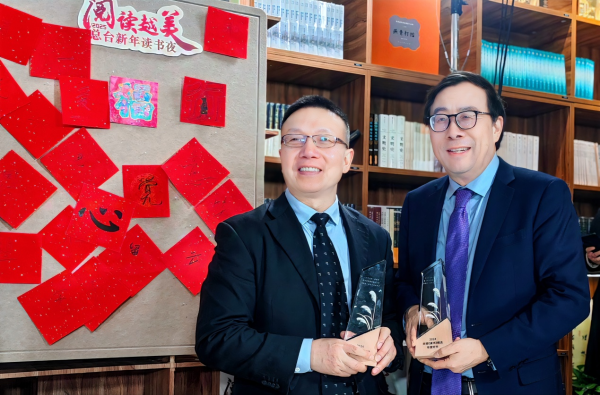 清華大學教授彭凱平(右)和清華大學出版社總編輯盧先和(左)出席活動并領取獎杯