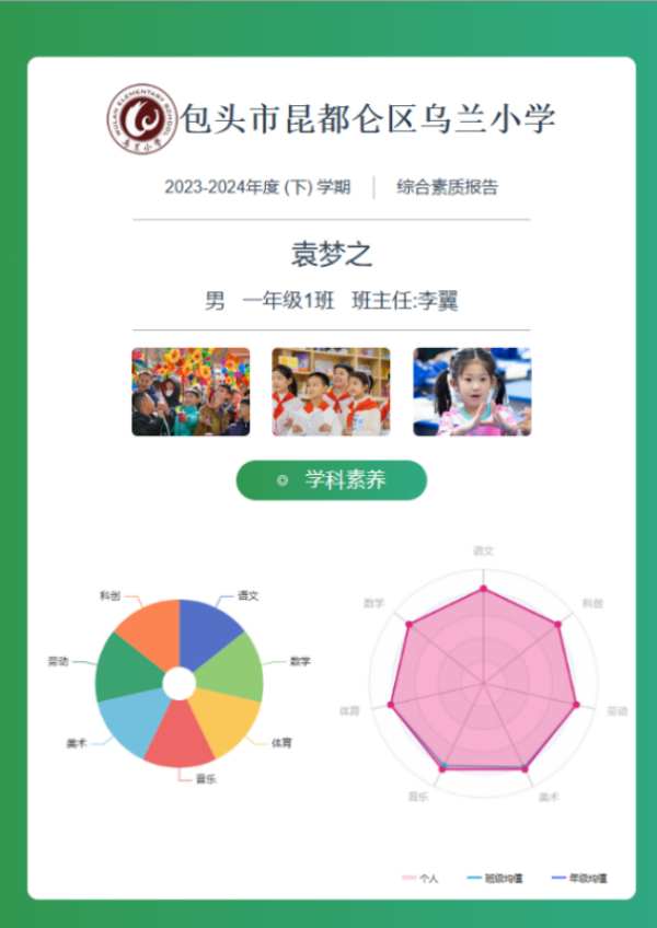 在期末學業評價中,任課教師會根據學生的日常表現及學科監測情況,從學生的學科觀念及學科素養等方面進行星級評價,系統根據學生體質健康測評及無紙化測評等結果,生成學生的學期綜合素質報告冊,為每個學生生成自己的雷達圖,其中包括七大核心素養以及四個層級,清晰地呈現學生的優勢及潛力。報告冊內容涵蓋德智體美勞,以及科創、特長、獲獎、雛鷹爭章、數字影像、班主任寄語等方面,全方位體現學生的成長足跡。