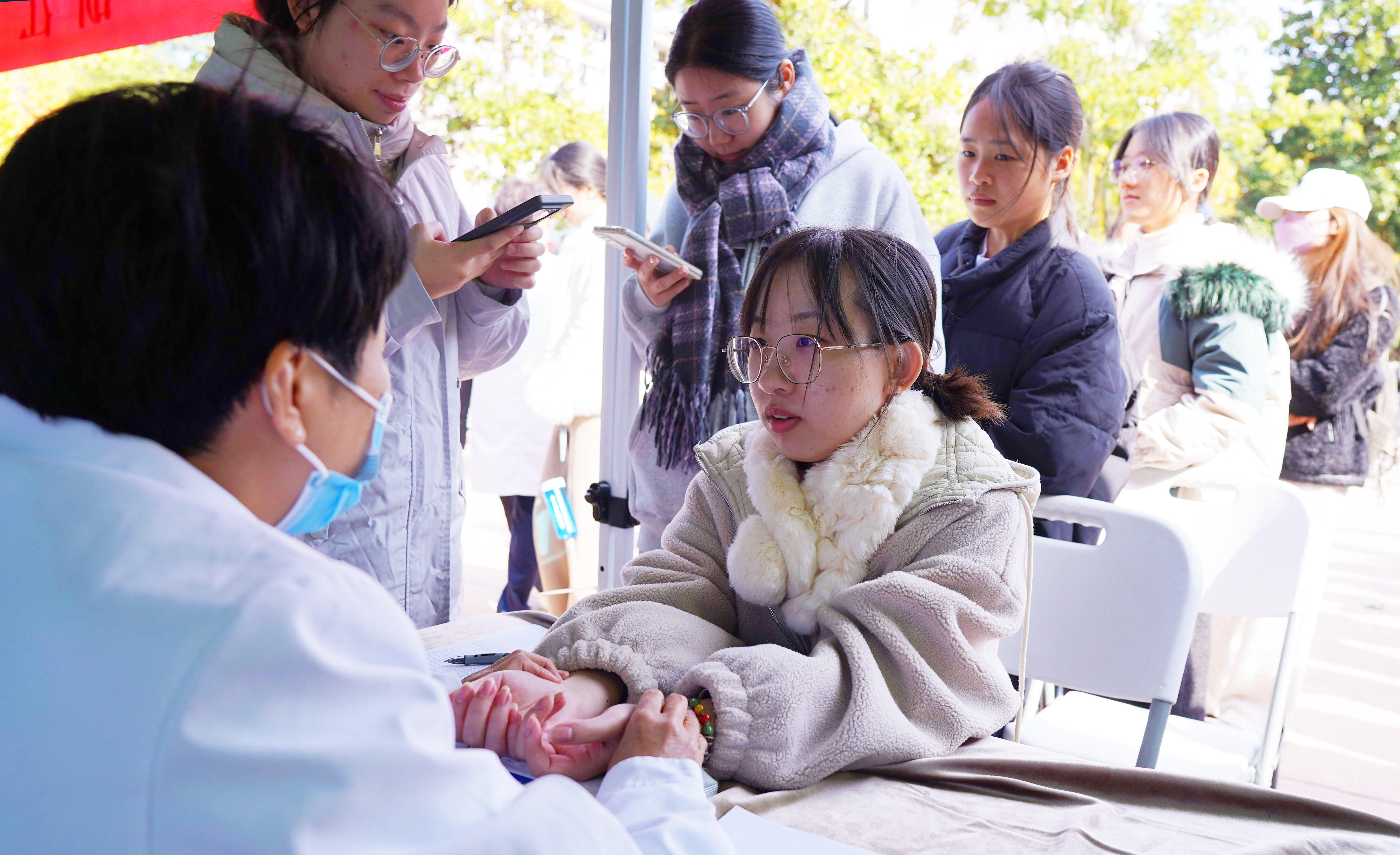 11月18日,浙江省杭州市臨安區(qū)中醫(yī)院的醫(yī)生們走進浙江農(nóng)林大學,為該校學生問診把脈,送去養(yǎng)生知識,守護學生健康。(中國教育報-中國教育新聞網(wǎng)通訊員 陳勝偉 攝)