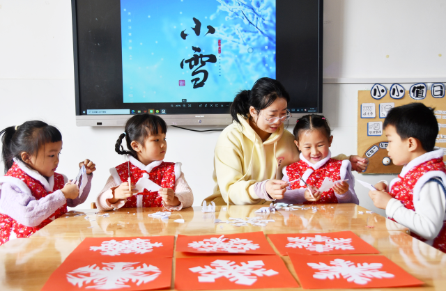 11月21日,湖南省永州市江永縣工業(yè)集中區(qū)幼兒園老師在指導小朋友們剪紙“雪花”。小雪節(jié)氣來臨,該幼兒園開展以“剪雪花 迎小雪 知節(jié)氣”為主題的手工實踐活動,讓孩子們感悟節(jié)氣傳統(tǒng)文化的魅力。中國教育報-中國教育新聞網(wǎng)通訊員 田如瑞 攝
