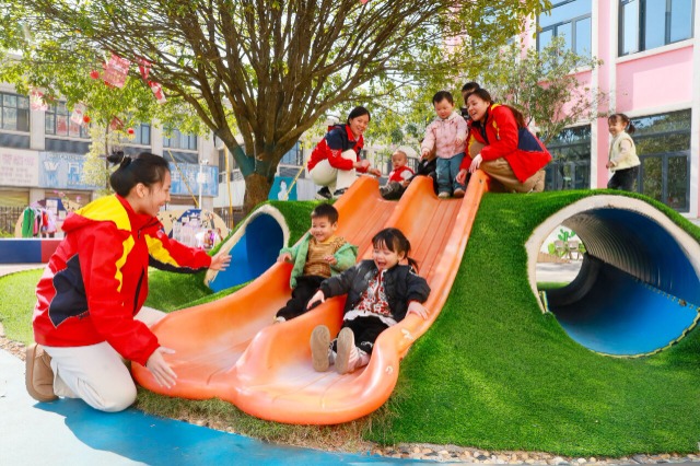 11月24日,湖南省永州市新田縣潤興幼兒園瑪利婭蒙特梭利托育早教中心,教師帶著托育班的孩子在參加戶外活動。該托育早教中心是湖南省首批托育服務示范機構,開設普惠托育服務,推進學前教育和托育服務協調發展。近年來,湖南省新田縣將發展普惠托育服務作為民生重點工作之一,聚焦“3歲以下嬰幼兒照護”民生實事,積極推動公辦幼兒園、普惠園、社會力量共同興辦發展托育教育,通過落實健康保健、資金補貼、志愿服務等多層面扶持政策,逐步建立起覆蓋城鄉的托育服務體系,有效緩解家庭育兒壓力。中國教育報-中國教育新聞網通訊員 劉貴雄 陳祉凝 攝
