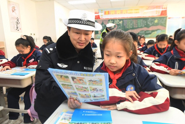 11月28日,在河北省石家莊新樂市新華路小學,民警向小學生普及交通標識知識。12月2日“全國交通安全日”到來之際,各地的中小學、幼兒園開展交通安全宣傳教育活動,讓孩子們了解相關知識,增強交通安全意識。中國教育報-中國教育新聞網通訊員 賈敏杰 攝