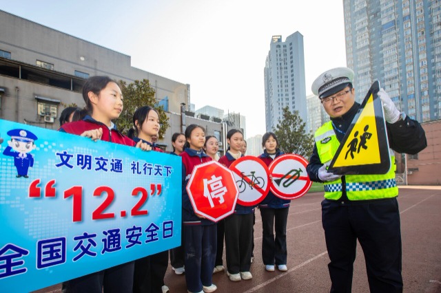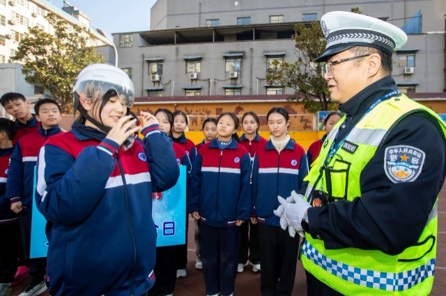 11月28日,湖北省襄陽市諸葛亮中學開展全國交通安全日主題實踐活動,為同學們送上一堂干貨滿滿的“交通安全實戰課”。活動現場,民警通過交通手勢現場教學、安全頭盔規范佩戴實操、交通標識趣味識別、汽車盲區實景認知等形式,打破傳統宣講模式,讓同學們在互動參與中直觀掌握交通安全知識,切實提升交通安全素養,筑牢青少年出行安全防線。中國教育報-中國教育新聞網通訊員 李旭暉 攝