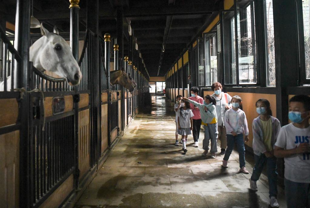 在新疆古生態(tài)園汗血馬基地,幾名小朋友在導(dǎo)游的介紹下觀察汗血馬(2022年6月16日攝)。新華社記者 王菲 攝