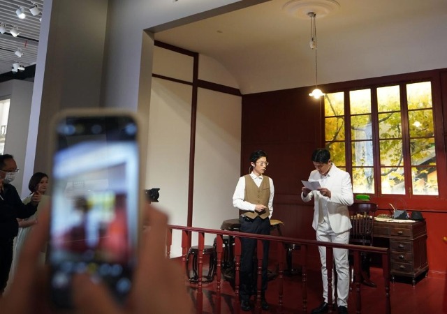2023年5月18日晚,中共一大紀念館原創的情景黨課《又見新青年》在展廳內實景演出。自2021年中國共產黨成立100周年之際全新開放以來,中共一大紀念館對紅色文化的創新傳播正不斷“圈粉”年輕人。新華社記者 劉穎 攝