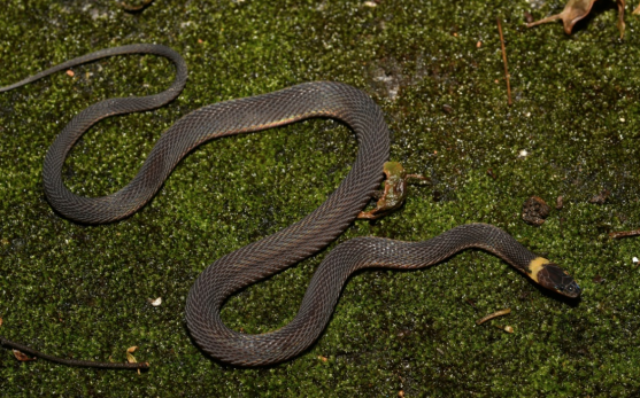 2022年10月14日,莫小陽團隊成員李輝、朱樂強等在懷化市通道縣進行生物多樣性資源調查,突然,一條被汽車壓扁的蛇吸引了他們的注意力。“它和我們以往看到的脊蛇有些不一樣,頸部有乳黃色的環紋。”對野生動物非常熱愛的李輝敏銳地意識到“這條蛇不簡單”。隊員們將它帶回了實驗室,經過形態學分析以及分子檢測,發現該種與已知的脊蛇屬其他物種均有差異。