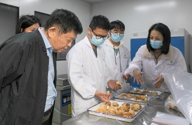 李玉院士(右一)考察江蘇農(nóng)林職業(yè)技術(shù)學(xué)院食用菌育種中心