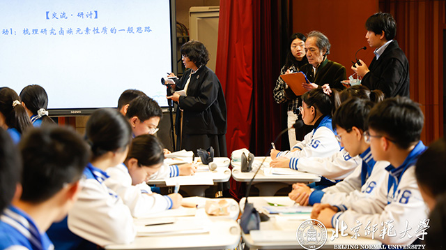 圖為佐藤學觀摩北京市第十八中學化學課《元素周期表的應用——研究鹵族元素的性質》教學現場 北京師范大學供圖