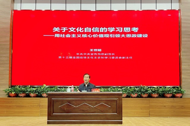 中國教育報-中國教育新聞網(wǎng)訊(通訊員 司宣)為深入學(xué)習(xí)貫徹習(xí)近平總書記近日對學(xué)校思政課建設(shè)作出的重要指示精神,牢牢把握教育的政治屬性、戰(zhàn)略屬性、民生屬性,5月16日,大連藝術(shù)學(xué)院黨委邀請中共中央宣傳部原副部長、第十三屆全國政協(xié)文化文史和學(xué)習(xí)委員會副主任王世明同志做客學(xué)院,作題為《關(guān)于文化自信的學(xué)習(xí)思考——用社會主義核心價值觀引領(lǐng)大思政建設(shè)》的宣講報告。