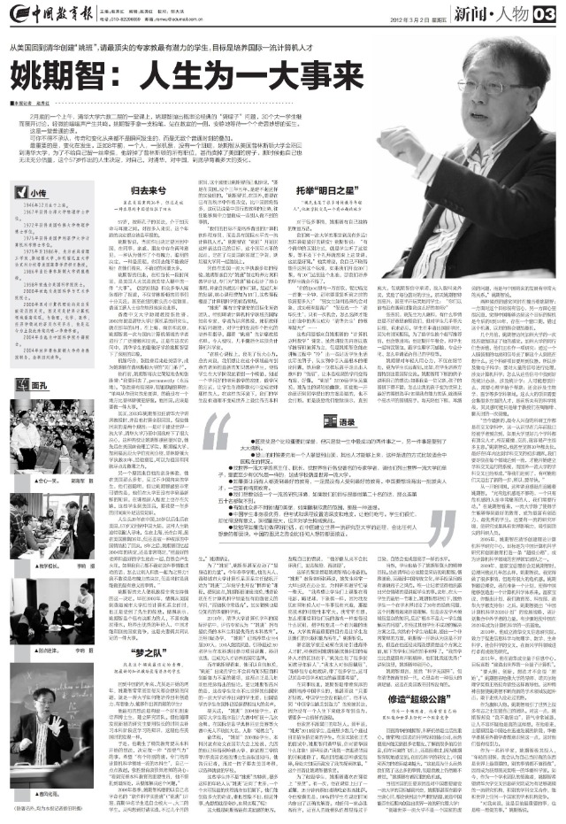 中國教育報曾多次專題報道姚期智院士回國任教的先進事跡和心路歷程,其中,本報記者、時任人物版主編趙秀紅曾在2012年對其進行整版專訪。舊文有溫度,現(xiàn)將這篇報道與讀者分享。