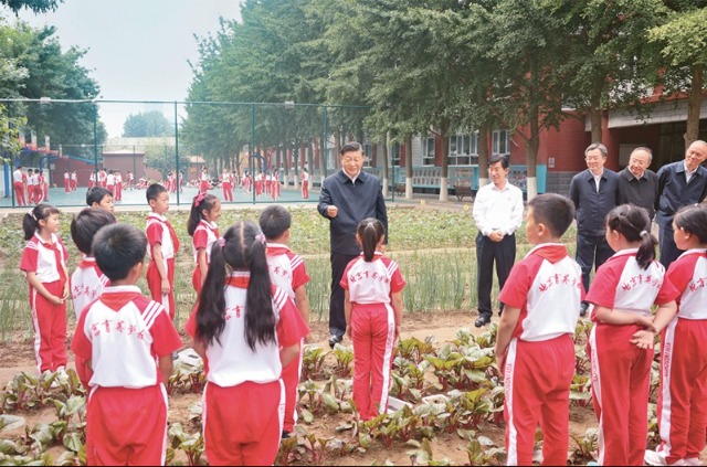 2023年5月31日上午,中共中央總書記、國(guó)家主席、中央軍委主席習(xí)近平來(lái)到北京育英學(xué)校看望慰問師生,向全國(guó)廣大少年兒童祝賀“六一”國(guó)際兒童節(jié)快樂。這是習(xí)近平在學(xué)生農(nóng)場(chǎng)同正在進(jìn)行農(nóng)業(yè)種植實(shí)踐的小學(xué)生們親切交流。 新華社記者 鞠鵬/攝