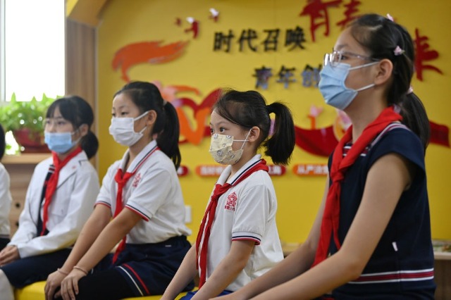 天津市和平區新星小學學生在觀看電影《我和我的祖國》(2021年9月28日攝)。新華社記者 李然 攝