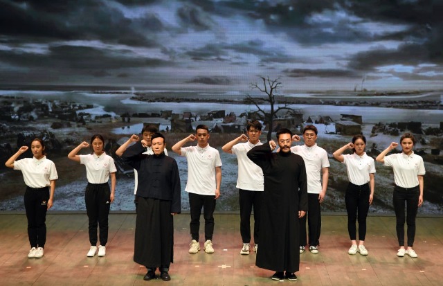 電視劇《覺醒年代》主創團隊走進北京大學,劇中主要演員與北大學生同臺演出(2021年4月20日攝)。新華社記者 任超 攝