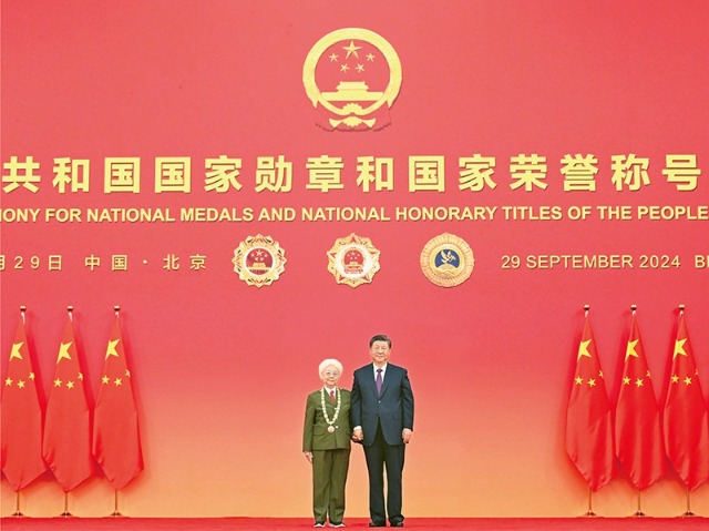 2024年9月29日,中華人民共和國國家勛章和國家榮譽稱號頒授儀式在北京人民大會堂金色大廳隆重舉行。中共中央總書記、國家主席、中央軍委主席習近平向“人民藝術家”國家榮譽稱號獲得者田華頒授獎章。新華社記者 謝環馳/攝