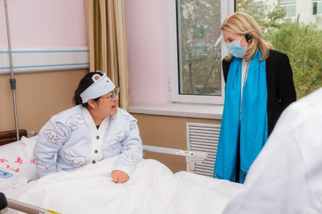 10月16日,聯合國兒童基金會執行主任凱瑟琳·拉塞爾在寧夏銀川市永寧縣人民醫院與新生兒早期基本保健項目受益人交談。新華社發