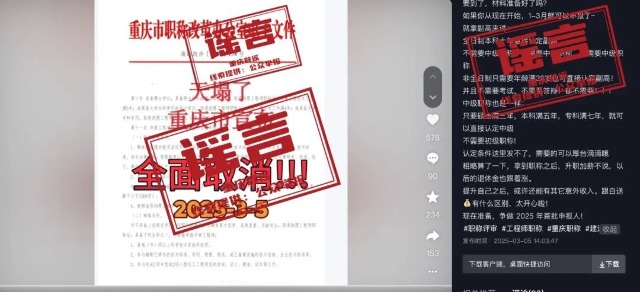近日,某網民在互聯網平臺發布消息稱“重慶市宣布,申請評審的要求取消了很多條條框框,職稱申請不看前置職稱,全日制本科十年直接認定副高,不需要中級職稱!”,引發關注。經核實,網傳信息系謠言。