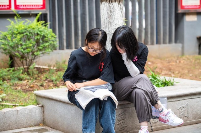 在湖南長沙市第一中學考點,考生在考場外復習(2023年6月7日攝)。新華社記者 陳思汗 攝