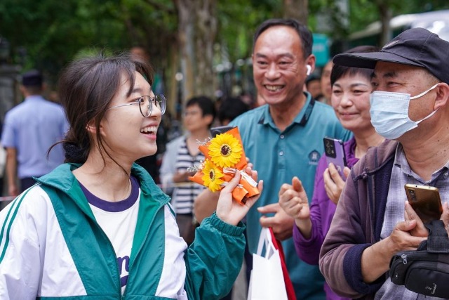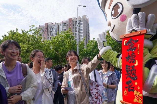 在江蘇省南京市建鄴區中華中學考點,考生與送考人偶擊掌(2024年6月7日攝)。新華社記者 李博 攝