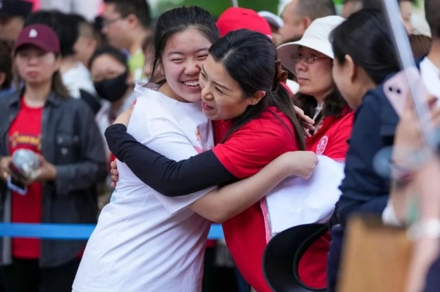 6月7日,在哈爾濱市第九中學考點,考生走入考場前與老師擁抱。新華社記者 王建威 攝