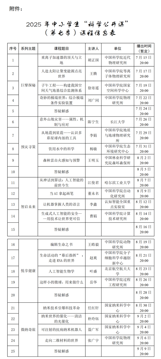 2025年中小學生“科學公開課”(第七季)課程信息表
