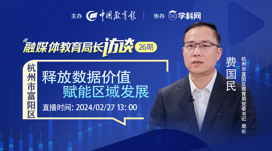 富陽(yáng)歷史悠久、人文底蘊(yùn)深厚,是東吳大帝孫權(quán)的故里,現(xiàn)代文豪郁達(dá)夫的故鄉(xiāng)。而今天,我們被富陽(yáng)特色的三維教育質(zhì)量監(jiān)測(cè)體系所吸引。7年探索,數(shù)據(jù)賦能,富陽(yáng)區(qū)研發(fā)“質(zhì)量評(píng)估——活力評(píng)估——自我評(píng)估”新型三維教育質(zhì)量監(jiān)測(cè)體系。本期,我們邀請(qǐng)到了杭州市富陽(yáng)區(qū)教育局黨委書(shū)記、局長(zhǎng)費(fèi)國(guó)民做客《中國(guó)教育報(bào)》融媒體教育局長(zhǎng)訪談直播間,與大家分享富陽(yáng)教育高質(zhì)量發(fā)展的探索與經(jīng)驗(yàn)。
