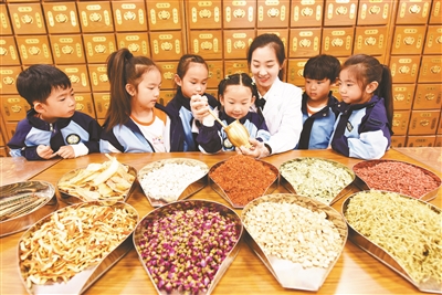10月19日,江蘇省連云港市東海縣中醫院中藥師向西雙湖幼兒園孩子演示怎樣使用搗中藥的沖筒。在10月22日第33個“世界傳統醫藥日”到來之際,西雙湖幼兒園開展以“學中醫、認中藥、感受中國傳統文化”為主題的教育活動,讓孩子們感受中醫藥傳統文化魅力。張玲 攝