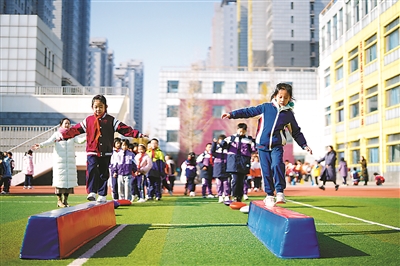 十一月十七日,河北省唐山市路北區橡樹灣小學學生利用課間時間玩平衡木。唐山市路北區鼓勵各中小學利用課間時間組織學生開展豐富多樣的文體活動,幫助孩子在體育鍛煉和趣味游戲中享受樂趣、增強體質。新華社記者 牟宇 攝