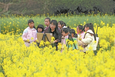 3月17日,學生們在貴州省開陽縣米坪鄉油菜花田里寫生。近日,隨著氣溫升高,人們紛紛來到戶外踏青游玩,樂享春日時光。新華社發