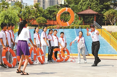 7月3日,在山東省青島市李滄區(qū)浮山路街道東李社區(qū)新時代文明實踐站,志愿者指導(dǎo)孩子們模擬體驗使用救生圈救援。張鷹 攝